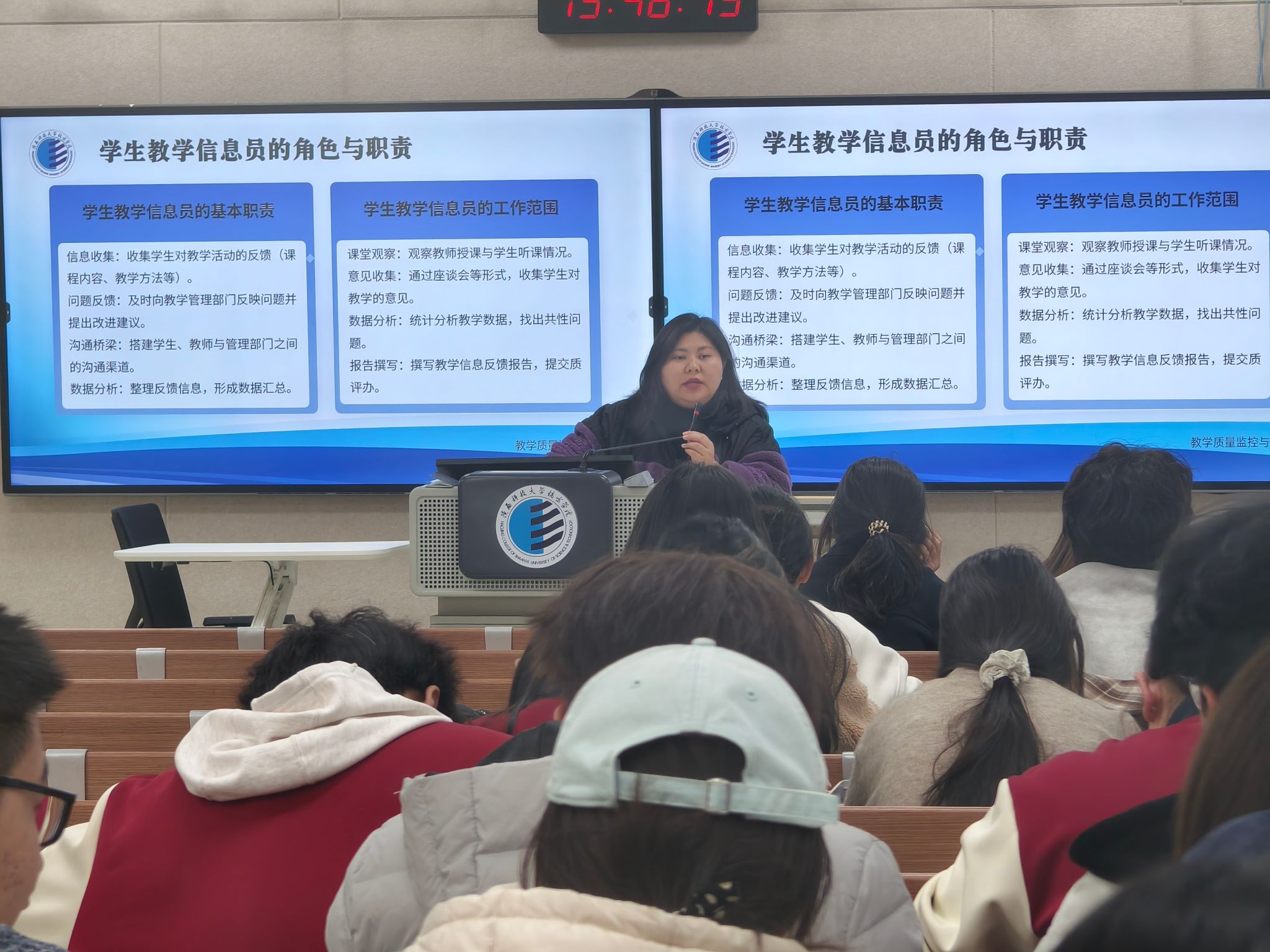 会上,质评办李老师围绕学生教学信息员的工作职责、信息反馈流程及相关工作要求进行了系统讲解,重点强调了信息收集的规范性、反馈内容的真实性以及提交记录的及时性。针对前期工作中存在的格式填写不规范、信息上交不及时、内容表述不清晰等问题,提出了具体整改要求,进一步明确了反馈标准和工作流程。