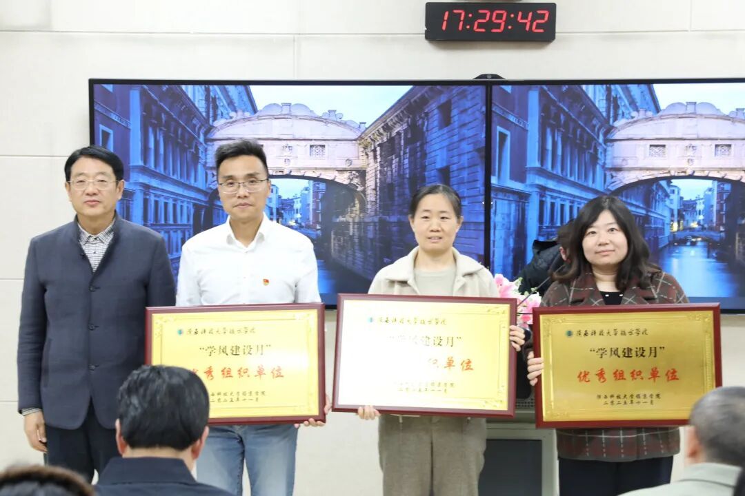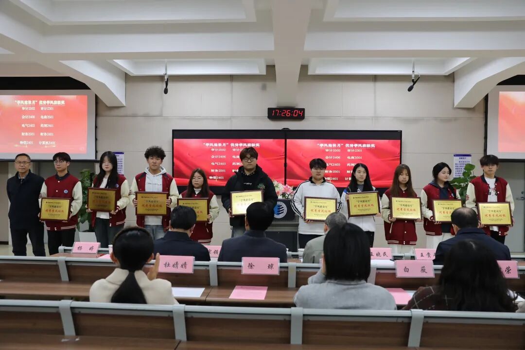 教务处副处长刘小庆宣读 “学风建设月” 活动表彰决定。在热烈的掌声中,颁奖仪式有序进行。校党委书记王贵平、校长刘子建、执行校长黄国泉、副校长王晓民、李宗领分别为获奖优秀个人及单位颁奖,表彰先进的同时,也激励着全体师生见贤思齐、奋勇争先。