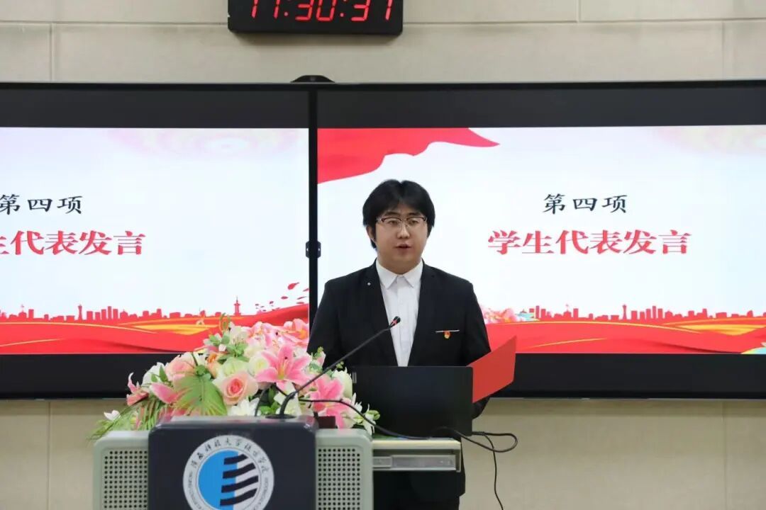 经济贸易学院行政2401班学生王子达作为学生代表发言。他分享了自己参与“最美学习笔记”“校园宣讲大赛”“文明宿舍”三项核心活动的收获与感悟:既有凭借扎实积累在学习笔记评选中名列前茅的喜悦,也有因对文化内涵挖掘不深在宣讲大赛中留有遗憾的反思,更在宿舍共建中体会到集体协作的温暖。他表示,将把活动中的体悟转化为实际行动,分享高效学习方法,带动班级优良学风,以 “四会” 要求锤炼自我,争做新时代优秀大学生。