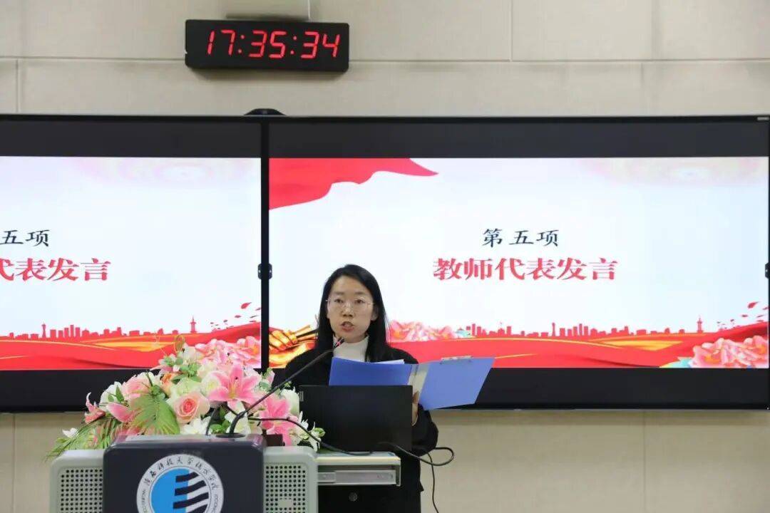 会计学院教师王敏作为教师代表发言。她围绕“德融财智・真岗实练・数智驱动深耕地方”的办学特色,分享了自己将“四层八阶” 理念融入教学的实践探索。她以获奖的“辅助生产费用的核算”教案为例,介绍了如何引入企业真实场景,让学生在模拟实践中掌握专业技能,同时融入职业操守与系统思维培养的教学思路。她表示,将继续紧跟学校人才培养改革步伐,深耕教学、潜心育人,为培养服务地方的应用型人才贡献力量。