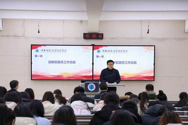 大会在庄重而热烈的氛围中拉开帷幕。首先,校长助理兼教务处处长刘斌对本次“创新实践月”活动进行了全面总结。他指出,2024年11月至12月,学校以“实践育人、创新赋能”为主题,开展了涵盖实践教学“大练兵”、创新创业实践专业团队建设、校级实验教学示范中心申报、校级虚拟实践平台建设、实习基地建设、计算机技能大赛、英语实践活动节、镐京文创创新实践展、挑战杯经验交流分享会、社会实践成果汇报等在内的15项重点活动。
